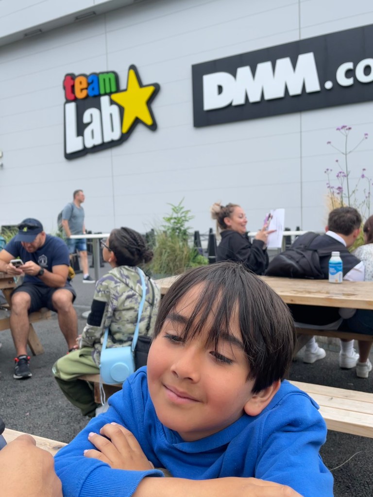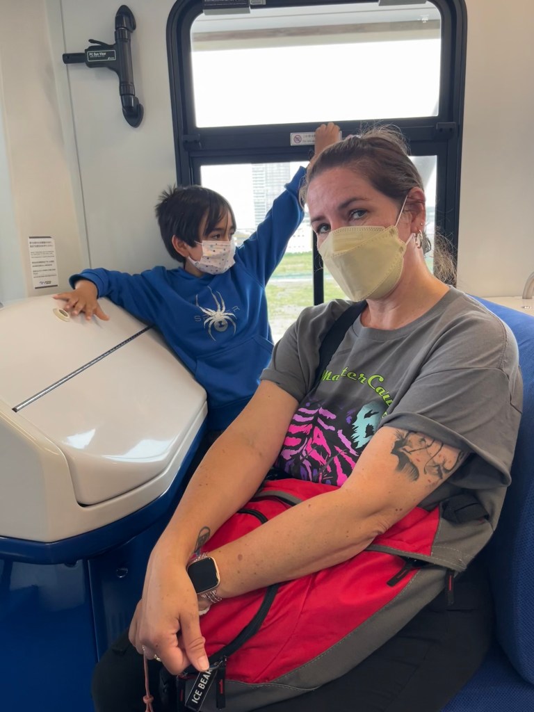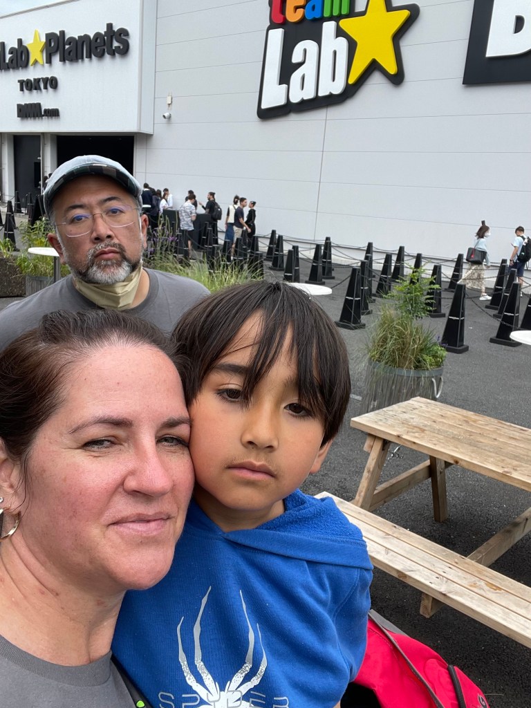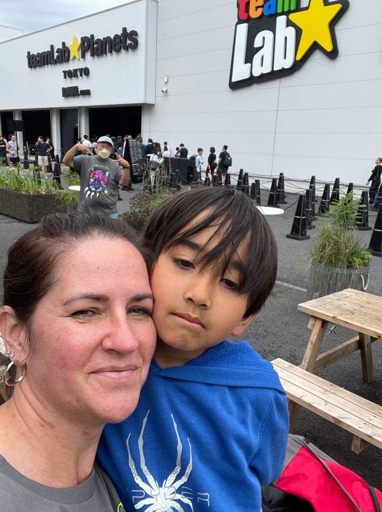 Team Lab isn’t really near anything in particular, so we just hung out and waited for our reservation time. There is an art store and coffee shop, but since Japan just opened back up to tourists, not everything is up and running. There was a planting of seating and the weather was perfect, so all we had to do was entertain the boy.