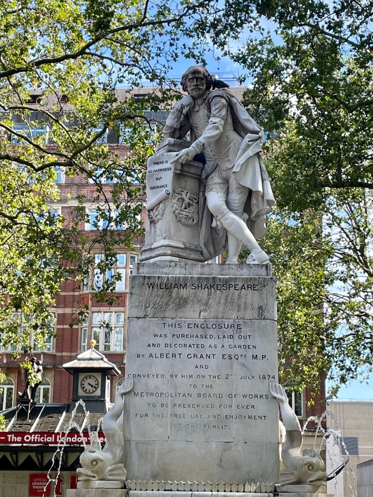 This statue of Shakespeare was part of our scavenger hunt, but I was more amused by the pigeon he wore on his shoulder. What an odd pose for the famous writer. (Ira’s pose is of someone forever peering into a refrigerator.) However, the statue is proudly placed in the center of the square and much beloved by people as it is by the birds. The birds may have a slight edge here.