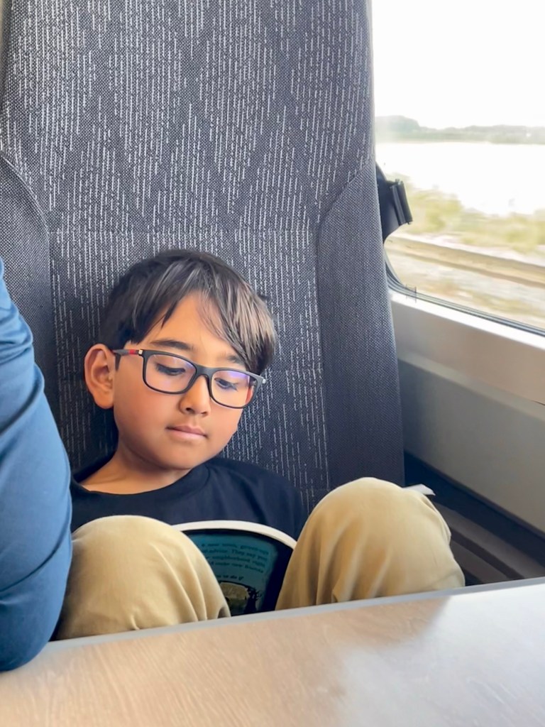 One of the things I will miss when we return is rail travel. I lose myself in a book. Ira sometimes writes or preps for class. This trip, we watch the landscape speed by—the rolling green, the sheep, the move from urban to rural. Bodhi got in a little reading on the two hour trip. His new glasses are so adorable on him.