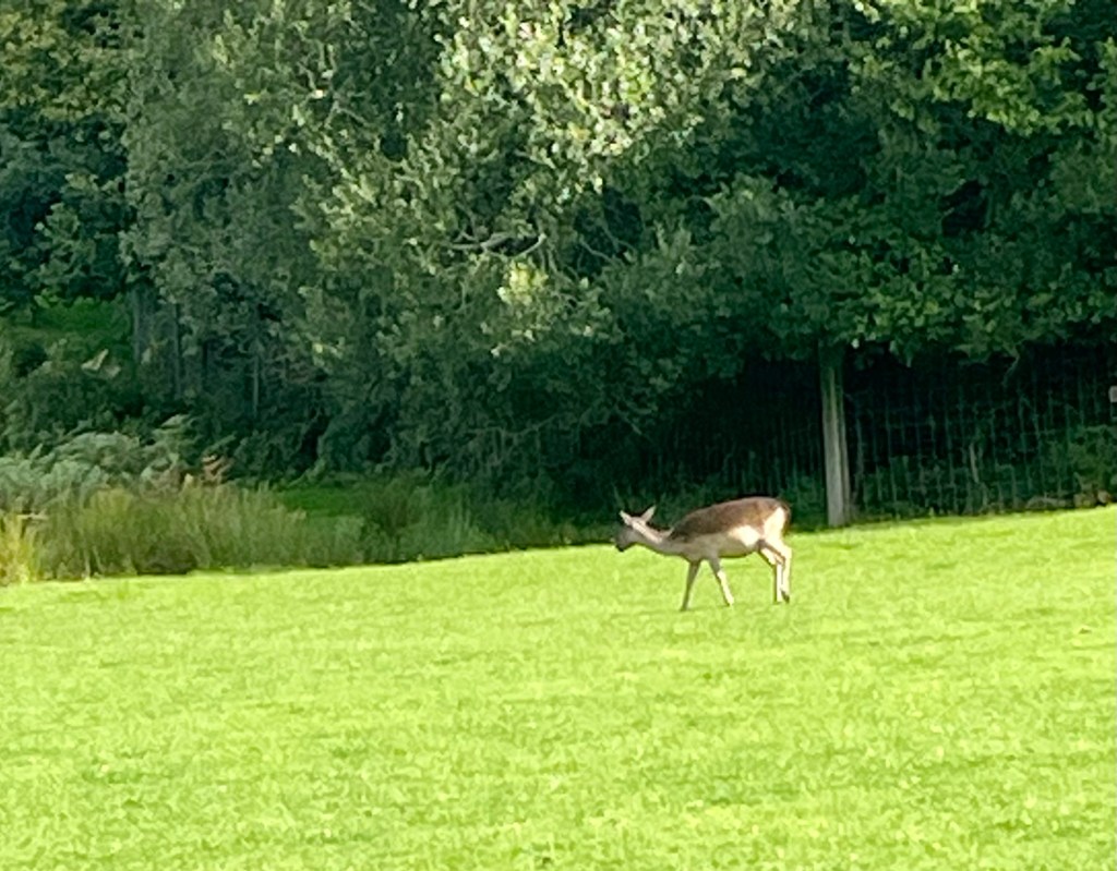 A quick lunch on the patio and then it was time for some grass tennis and another round of croquet before heading out to see the deer. Lunch was clearly more enticing for us as very few deer were brave enough to get close to us. We saw them while walking into the deer park, but they moved, en masse, to another part of the park, hidden from view. Except for one. She alone came and ate the food the guide threw in the field. More for her, I guess. Oh well. The hike to get to the deer park was emerald green, moss covering the trees. Sound contained a different quality in the woods. It kept everything in. It was as if we were traversing a fantasy forest. Ira kept telling Bodhi to keep an eye out for werewolves.