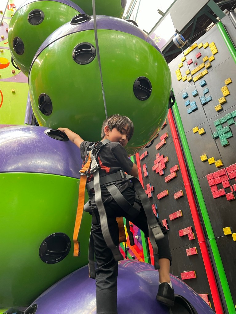 The balls where challenging for Bodhi because he couldn’t see around them to find his next grip. I chose to skip this one, as I did the the next one with the pipes. We wore our regular shoes and not climbing shoes so I couldn’t get a good grip with my feet. And then Bodhi decided he was up for the challenge of the big pipes in the middle of the floor. He watched several kids go first before he got the nerve.