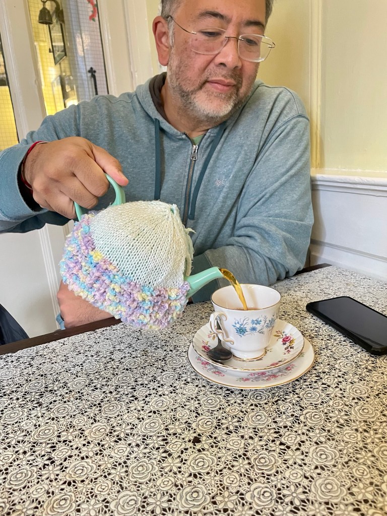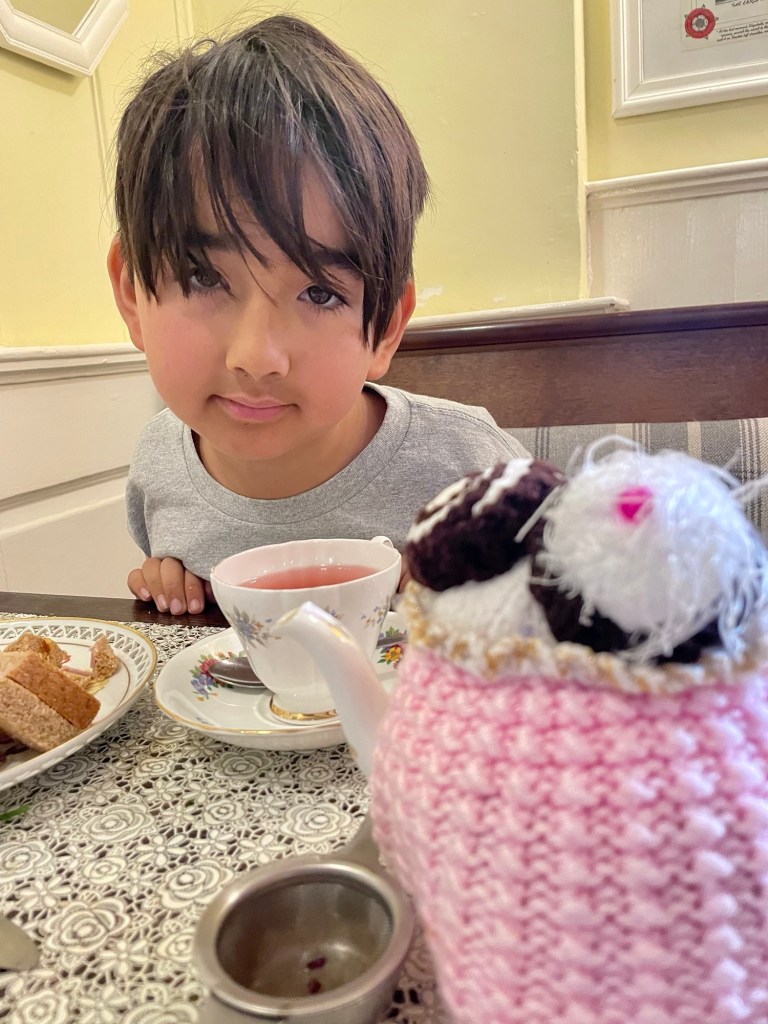 There are many tea houses in the UK. Some are more modern. Some are themed. I love the traditional, cozy vintage shops. The Tudor Rose was traditional, vintage and cozy. They had a kids tea as well, though Bodhi wasn’t sure about the savory sandwiches. It didn’t matter; Ira finished them for him. There is beautiful garden in the back, too, but it was a little chilly for us this particular day. This was the traditional tea experience we were looking for—a “proper” English experience with deliciously crafted food and warming English tea and cream. The tea cozy that covered pot really touched my crocheted little heart. I think I need to start making tea in a pot just so I can make a cozy for it.