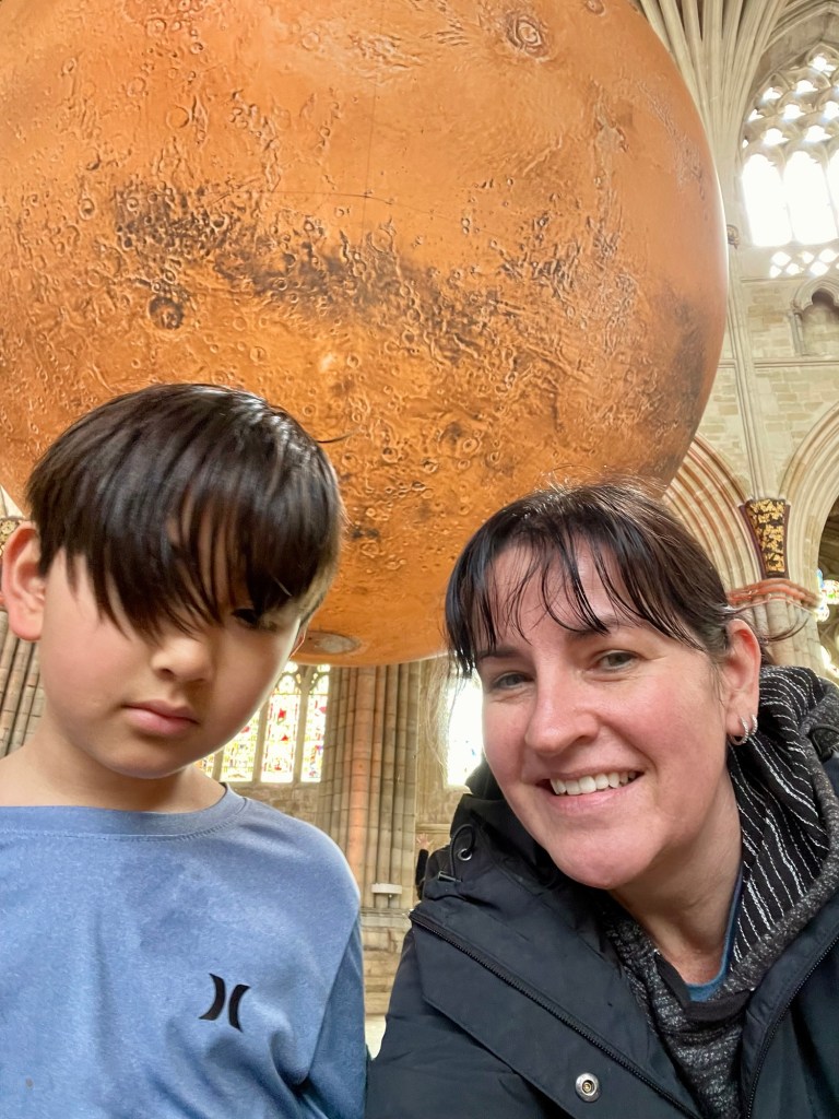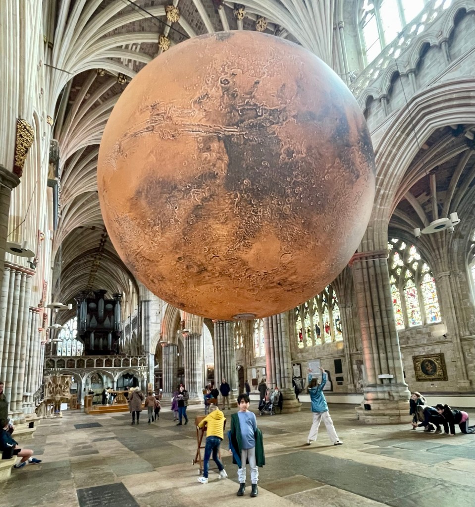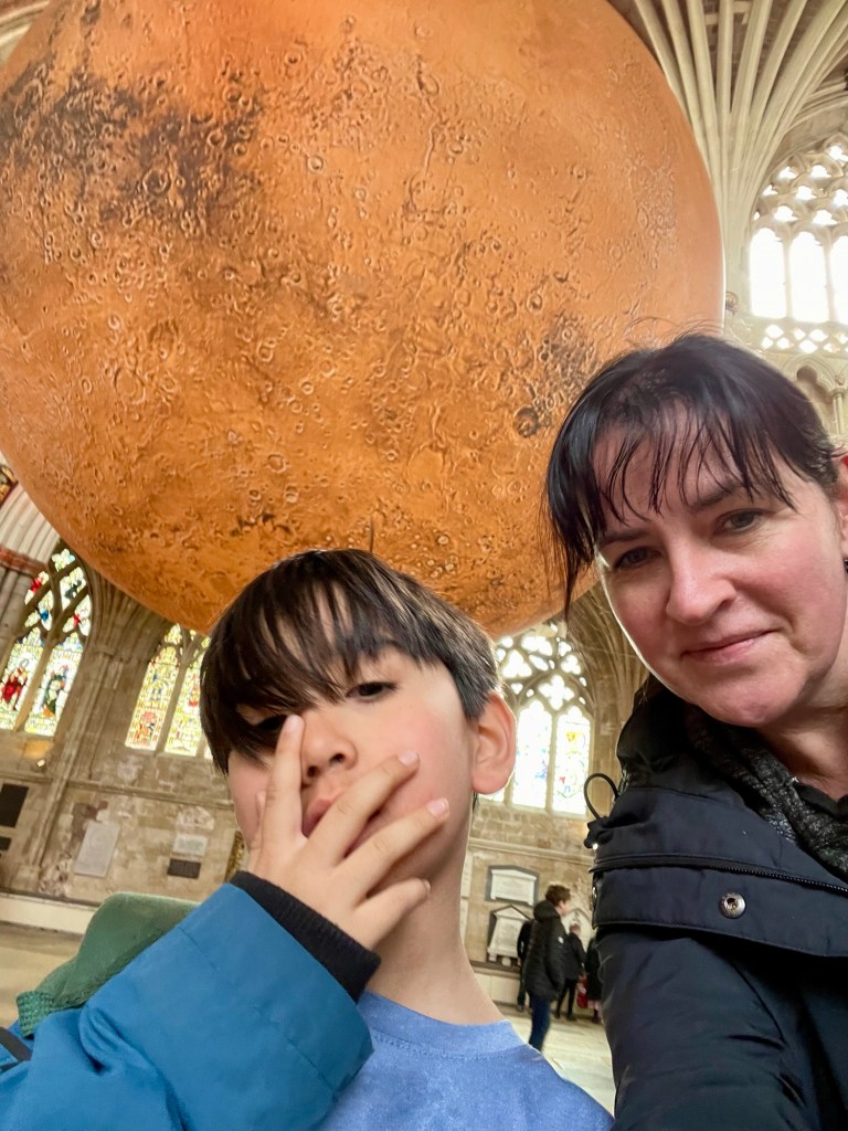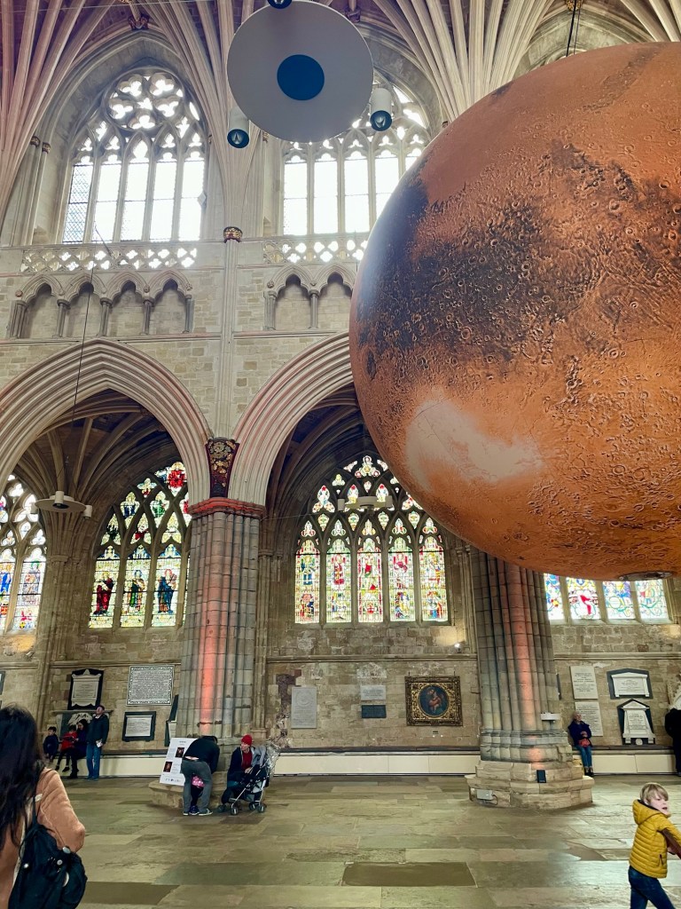 There is a British artist, Luke Jerram, with installations of different planets that rotate around the country. The cathedral was hosting his exhibit Mars: War and Peace, which is a seven-metre replica, created using high-resolution NASA imagery, so since I hadn’t visited yet, I grabbed Bodhi for a quick outing. We had already seen Gaia, which is the surface of Earth, at Trinity College in Dublin, Ireland, so we had a little bit of an idea of what to expect.